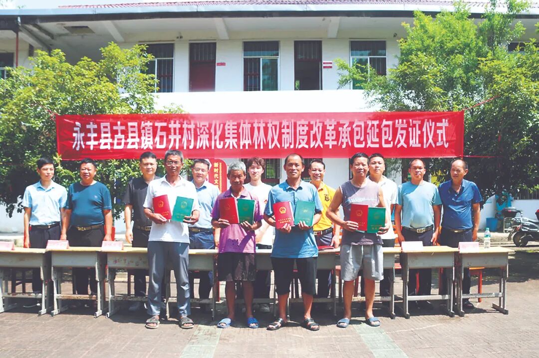 新时期,“单家独户怎么办”仍然存在着集体林权分散、林地破碎化、林农经营规模小等现实难题。借助数字化技术的应用,集体林改能够创新联户合作经营的多种数字化模式,促进林地流转,扩大集体林业社会化服务规模,保障农民权益的最大化实现。 一是创新数字化联户合作经营规模。发展林业数字化管理模式,加快林地规模化经营,运用数字平台建设和智能服务技术,增质赋能林业多种规模经营模式,如福建省南平市在全国创新开展“森林生态银行”试点建设,构建自然资源管理、开发和运营一体化的数字服务平台,通过平台赋能、集中收储和专业运营,实现林业资源优化配置以解决单家独户经营难题。同时,建立林业大数据平台,集成林地流转、生产经营、市场需求等多源数据,运用AI算法分析预测林业经营趋势,为农户提供个性化流转方案与联合经营策略建议。开发智能撮合系统,促进林地经营权的高效流转与优化配置。利用无人机与卫星遥感技术监测林地使用情况,为林权收储与分散林权整合提供精准数据支持,推动林业规模经营的数字化管理。江西省永丰县古县镇石并村举办深化集体林改承包延包发证仪式 吴光富摄